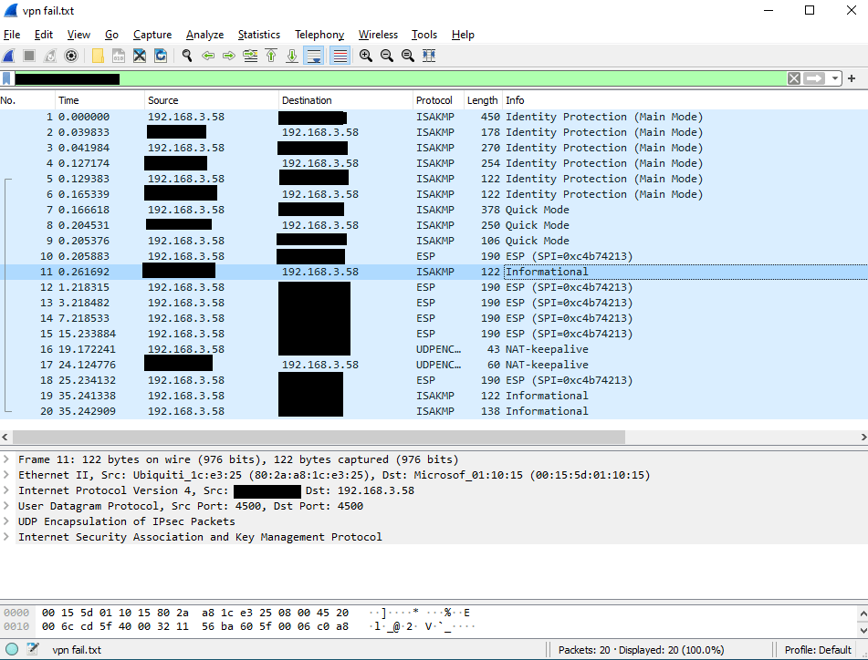 Wireshark monitoring of a failed connection reveals the IKE negotiation works and an encrypted tunnel is setup but the first ESP communication results in an informational ISAKMP protocol return that should not be there. This is the point of failure. There are some further notices that are not acknowledged and the connection times out.