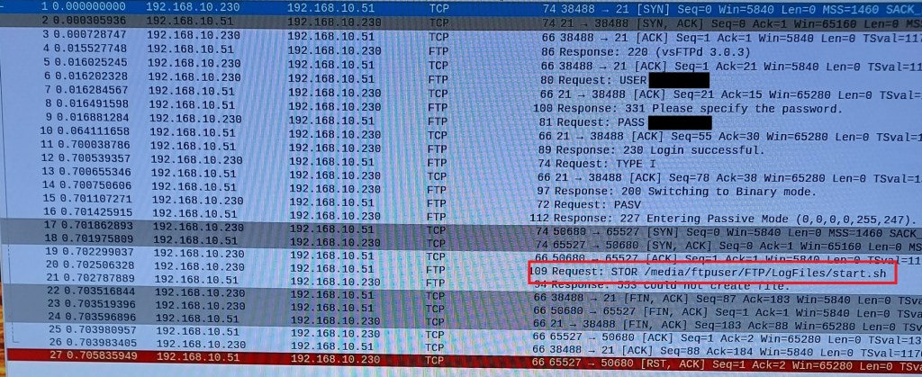 Shown in figure. The password has been accepted and communication switched to passive mode but the STOR command fails because the directory requested is not the directory configured by VSFTPD. The auth.log records the same error message as for the first 2 failures. It is an authorization failure but at a different point in the process.